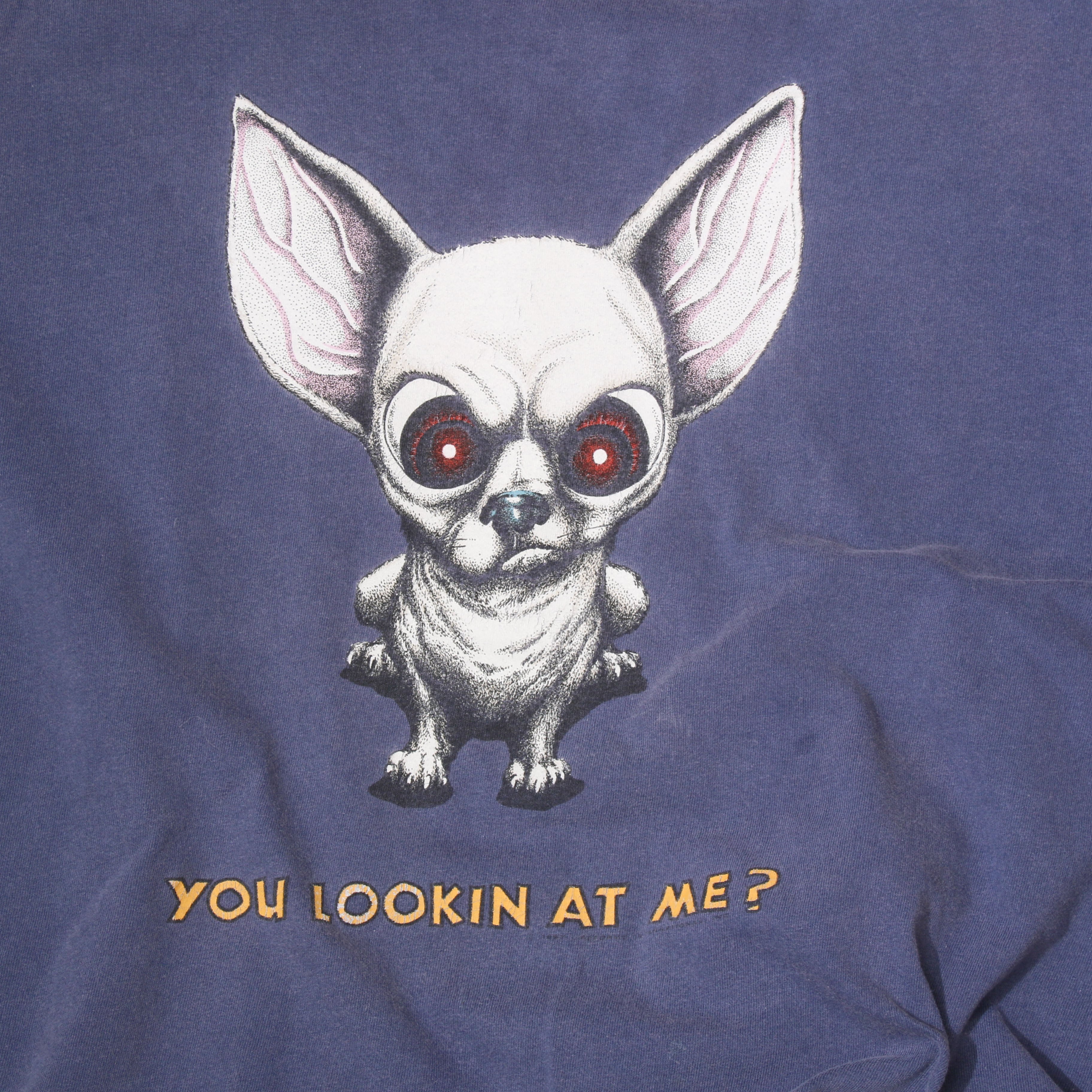 血管ムキムキのパキッと反ったチワワ?プリント。絵柄フェードした部分がピンクっぽくなってるボディもいい雰囲気。ディティール出来れば現物みせたいです。